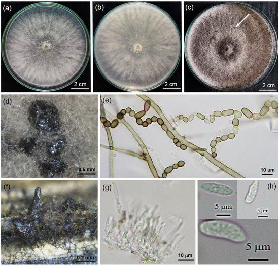 Morphological characteristics of PSU-SC02 on Hylocereus polyrhizus, 3-day-old colony on PDA in top (a) and bottom view (b), 4-week-old colony on PDA developed small black conidiomata ((c), arrow), zoom view of conidiomata (d), hyphae and arthroconidia (e), pycnidia developed on dried Napier grasses (f), conidiogenouse cells (g), and pycnidial conidia (h).