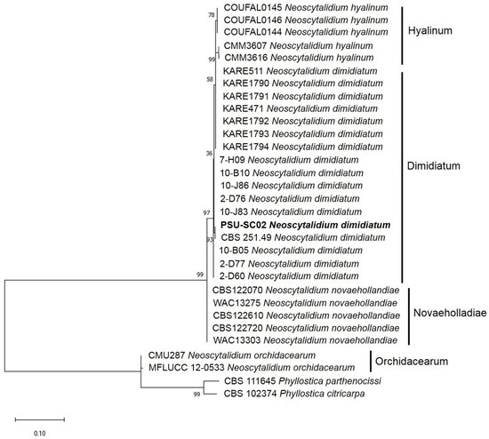 The PCR products of ITS, LSU, and tub were approximately 917, 1326, and 411 base pairs (bp) long, respectively. A BLAST search (https://blast.ncbi.nlm.nih.gov, accessed on 10 December 2021) revealed ITS, LSU, and tub sequences identical to those of Neoscytalidium dimidiatum, with 99.43%, 100%, and 99.76% identity, respectively. The DNA sequences of ITS, LSU, and tub of PSU-SC02 were deposited in GenBank and acquired accession numbers LC660640, LC660641, and LC660642, respectively. The maximum likelihood (ML) tree of the combined DNA sequences of ITS, LSU, and tub showed that the PSU-SC02 isolate grouped in the same clade as N. dimidiatum CBS 251.49 (Figure 3). Therefore, fungal isolate PSU-SC02 was identified as N. dimidiatum.
