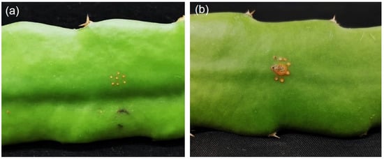 Due to increased planting areas and high demand, dragon fruit in many crops attract disease and pests. Several diseases have been reported to negatively affect dragon fruit plantations and production [4]. Disease caused by fungi is a major problem for dragon fruit plantations worldwide [3,5]. For instance, the fungus Colletotrichum gloeosporioides was found to cause anthracnose on dragon fruit in Malaysia [3]. The fungi Neoscytalidium dimidiatum and Bipolris sp. have been reported to cause canker and bipolaris black spot, respectively, on dragon fruit in Vietnam [5]. Furthermore, the fungus Gilbertella persicaria was recently reported to cause flower rot on red-fleshed dragon fruit in Thailand [6].