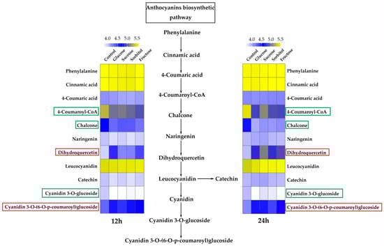 As the sugar-treated fruit was picked from the ‘Tianjin Shui Mi’ blood-fleshed peach landrace, we focused mainly on flavonoids in the anthocyanin biosynthetic pathway. Figure 1, Tables S3 and S4 shows that the metabolites dihydroquercetin and cyanidin-3-O-(6-O-p-coumaroyl) glucoside were upregulated markedly in flesh samples of peach fruit treated with glucose, sucrose, sorbitol, and fructose for 12 h and 24 h. The p-coumaroyl CoA, chalcone, and cyanidin 3-O-glucoside levels were lower in the peach fruit treated with the sugars for 12 h and 24 h than they were in the control. All other metabolites had similar levels in both the sugar-treated and control peach fruit. These results indicated that glucose, sucrose, sorbitol, and fructose all had similar effects on metabolite accumulation in vitro. Moreover, after four sugars treatment for 12 and 24 h, anthocyanins were not accumulated as cyanidin 3-O-glucoside, the main components in blood-flesh peach fruits, but as cyanidin-3-O-(6-O-p-coumaroyl) glucoside.