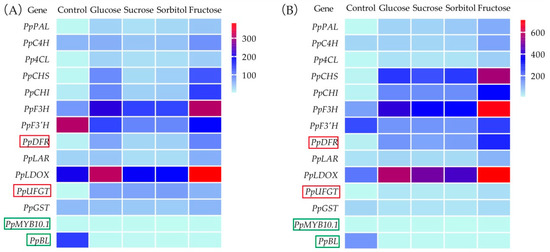 Heat map showing relative expression levels of anthocyanin biosynthesis and regulatory genes (FPKM) in flesh of sugar-treated and untreated peach fruit after 12 h (A) and 24 h (B). Gene names are shown on left side of map. Gene expression level increases with blue and red color intensity in the square within the heat map. PpDFR and PpUFGT are in red in the box. PpMYB10.1 and PpBL are in green in the box.