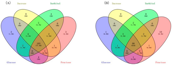 Venn diagrams showing numbers of upregulated TFs in flesh of glucose-, sucrose-, sorbitol-, and fructose-treated peach fruit after 12 h (A) and 24 h (B).