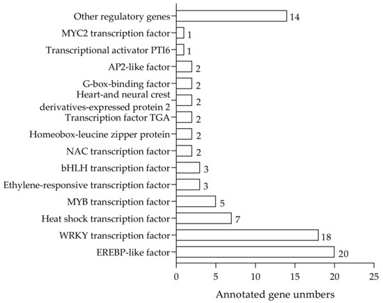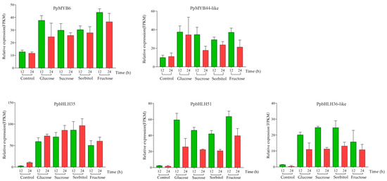 To identify the regulatory genes involved in anthocyanin biosynthesis in the flesh of sugar-treated peach fruit, we used the corresponding transcriptome data with fold change > 2.0 in the analysis. The results indicated that 120, 120, 124, and 116 of the upregulated TFs were identified in the flesh of the peach fruit treated with glucose, sucrose, sorbitol, and fructose, respectively, for 12 h. Then, 105 of these TFs were selected (Figure 3). Furthermore, 106, 108, 106, and 114 of the upregulated TFs were identified in the flesh of the peach fruit treated with glucose, sucrose, sorbitol, and fructose, respectively, for 24 h. Then, 98 of these TFs were selected, and 84 of the TFs common to both treatments had the potential in promoting anthocyanin biosynthesis, and these were thus selected for the subsequent analysis (Figure 4). Of these, the majority were WRKY- and EREBP-like gene family members and heat shock TFs ranked second. There were also eight MYB and bHLH gene family members. As MYB and bHLH family genes have been reported to regulate anthocyanin accumulation in the development of blood-flesh fruit [26], we selected two MYB genes designated PpMYB6 and PpMYB44-like and three bHLH genes designated PpbHLH35, PpbHLH51, and PpbHLH36-like according to their relative high expression to determine whether they regulate anthocyanin accumulation (Figure 5).