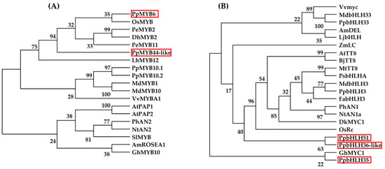 Phylogenetic analyses of amino acid sequences of MYB (A) and bHLH (B) TFs. Full MYB and bHLH TF amino acid sequence alignment and phylogenetic tree construction with MEGA-X software (Available online: https://www.megasoftware.net/dload_win_gui (accessed on 21 June 2021)). Numbers before binary structures indicate bootstrap test results for 1000-replicate analysis. PpMYB6, PpMYB44-like, PpbHLH35, PpbHLH51, and PpbHLH36-like are highlighted by solid red rectangles. National Center for Biotechnology Information (NCBI) accession numbers are as follows: OsMYB (CAA45509); PeMYB2 (AIS35919); DhMYB2 (AQS79852); PeMYB11 (AIS35928); LhMYB12 (BAJ05398); MdMYB1 (ABK58138); MdMYB10 (ABB84753); VvMYBA1 (BAD18977); AtPAP1 (NP-176057); AtPAP2 (NP-176813); PhAN2 (AAF66727); NtAN2 (ACO52472); SlMYB (AAQ55181); AmROSEA1 (ABB83826); GhMYB10 (CAD87010); VvMYC (NP-001267954.1); MdbHLH33 (ABB84474.1); AmDEL (AAA32663.1); LjbHLH (BAJ10680.1); ZmLC (P13526.1); AtTT8 (OAO98324.1); BjTT8 (AIN41653.1); MtTT8 (AKN796061); PsbHLHA (E3SXU4.1); MdbHLH3 (ADL36597.1); FabHLH3 (AFL02463.1); PhAN1 (AAG259281); NtAN1a (AEE992571); DkMYC1 (AEC03343.1); OsRc (BAF42667); and GhMYC1 (CAA07615).