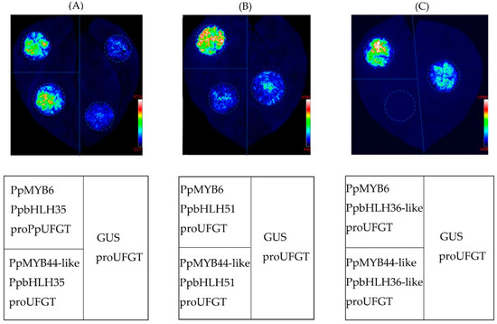 The promoter sequence of Pp.UFGT from ‘Tianjin Shui Mi’ was synthesized at Beijing Liuhe Bgi Co. Ltd. (Beijing, China) and infused into pGreenII 0800LUC vector [26,46]. The sequence of promoter of PpUFGT was taken from GDR database (Available online: https://www.rosaceae.org (accessed on 12 July 2021)). The coding sequences (CDS) of PpMYB6, PpMYB44-like, PpbHLH35, PpbHLH51, and PpbHLH36-like selected from the transcriptome analysis were also synthesized at Beijing Liuhe Bgi Co. Ltd. and inserted into the pBI121 vector under the control of the 35 s promoter. The GUS gene was infused into the pBI121 vector as a negative control [26]. All recombinant vectors were transformed into A. tumefaciens GV3101 and incubated at 28 °C for 2 d. Individual transformants were resuspended in 1.0 mL Luria-Bertani (LB) medium (Solarbio Beijing China) containing 50 mg/mL kanamycin for 10 h. Ten microliters were placed in 15 mL LB medium containing 50 mg/mL kanamycin and shaken at 28 °C for 8–12 h. After centrifuging and removing the medium, we adjusted the agrobacteria OD to 0.4–0.6 with infiltration buffer comprising 0.5 M MES, 1.0 mM MgCl2, and 1.0 μM acetosyringone. The suspension was injected into three young leaves per tobacco (Nicotiana benthamiana) plant. The leaves injected with agrobacteria were excised after 2.5 d, immersed in D-luciferin sodium salt solution for 10 min, and placed in a multifunctional imaging analysis system (Tanon, Shanghai, China) to measure luminosity.