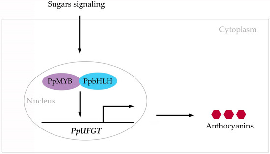 Model of two MYB and three bHLH3 TFs activating anthocyanin accumulation in flesh of peach fruit treated with four different sugars in vitro. Black arrow pointing to PpMYB and PpbHLH indicates that sugar signaling had a positive impact on their biosynthesis. Black arrow pointing to PpUFGT indicates that PpMYB and PpbHLH bind PpUFGT promoter. Folded line with arrow indicates that PpMYB and PpbHLH upregulate PpUFGT. Black arrow pointing to anthocyanins indicates that PpUFGT induces their biosynthesis. Sugar signaling was mediated by glucose, sucrose, sorbitol, and fructose. PpMYB includes PpMYB6 and PpMYB44-like. PpbHLH includes PpbHLH35, PpbHLH51, and PpbHLH36-like.