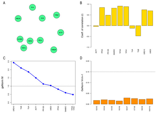 Finally, to validate the expression stability of candidate reference genes two statistical algorithms were used, geNorm and BestKeeper, implemented in the ctrlGene R package [59], which was used with default parameters for both analyses. GeNorm is an algorithm that carries out two analyses: (1) determining the most stable reference gene based on the geometric mean of reference genes; (2) informing whether more reference genes are required [60]. GeNorm provides an “M” value (stability measure) which represents the variation of a certain gene versus all other normalizing genes. The M value is defined as the average pairwise variation between a gene and all other reference genes. Recent evidence suggests that if the “M” value is less than one indicates high stability expression so it will be an appropriate reference gene. This same statistical method was also used to analyze the variation of pairs of candidate reference genes with the purpose of determining the optimal number of reference genes for an accurate subsequence normalization. Generally, it is recommended to use at least two reference genes, although more could be used if the “PV” or “(Vn/n+1)” value (paired variation) exceeds the threshold PV of 0.15 [61]. Additionally, BestKeeper [62] was used to select the best reference genes based on expression stability, taking into account three statistical variables: standard deviation (SD), Pearson coefficient of correlation (r) and percentage covariance (CV) [63]. BestKeeper determines an index which is calculated from the Cq arithmetic mean of each candidate reference gene, being the most stable reference genes those having a higher r-value [64,65].