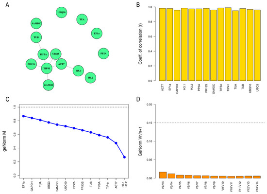 Analysis of reference genes stability in petal tissue based on different algorithms. (A) Equivalence graph obtained from 13 candidate reference genes in the petal tissue, where the node connected implies that there is an equivalence between these candidate reference genes, according to SARP.compo. (B) Representation of correlation coefficients (r value) of the ten candidate reference genes in petal tissue calculated by BestKeeper software. (C) Average expression of stability (M value) of thirteen candidate reference genes provided by geNorm approach. Dotted line indicates cut-off value of one below which a reference gene is considered stable enough to be used in normalization. (D) Determination of the optimal number of reference genes required for normalization in Dianthus broteri petal tissue. Dotted lined determine cut-off of 0.15 above which another reference gene will need to be introduced for appropriate normalization.