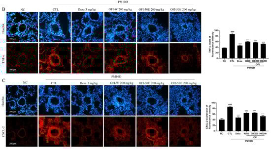 Immunofluorescence staining for interleukin-1 receptor-associated kinase 1 (IRAK1), TNF-α, and CXCL-1 protein expression in the lungs of mice with PM10D-induced airway inflammation. (A) IRAK1, (B) TNF-α, and (C) CXCL-1 expression in the lungs. NC: BALB/c normal control group; CTL: PM10D-induced control group; Dexa: 3 mg/kg dexamethasone-treated PM10D-induced group; OFI-W 100 and 200: PM10D-induced group treated with 100 and 200 mg/kg OFI-water extract, respectively; OFI-30E 100 and 200: PM10D-induced group treated with 100 and 200 mg/kg OFI-30% ethanol extract, respectively; OFI-50E 100 and 200: PM10D-induced group treated with 100 and 200 mg/kg OFI-50% ethanol extract, respectively. Data are expressed as means ± SEM, n = 8. ### p < 0.005 vs. NC; * p < 0.05, *** p < 0.005 vs. CTL.