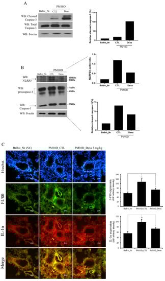 Particle pollutants trigger and exacerbate inflammation. Inhaled fine particulates are engulfed by alveolar macrophages and induce alveolar macrophage cell death via pyroptosis. Dead cell-derived factors such as IL-1α/β are released and form inducible bronchus-associated lymphoid tissues (iBALT), which may contribute to particulate-pollution-induced inflammation [11,12]. During pyroptosis, caspase-1 expression and the formation of the NLRP3 inflammasome are increased [11]. To investigate the effects of dexamethasone on PM10D-induced airway inflammation, inflammatory cell death (pyroptosis) was evaluated in PM10D-exposed mice receiving dexamethasone. Expression of cleaved caspase-3 was increased in the lungs of PM10D-exposed mice receiving dexamethasone compared to that in untreated PM10D-exposed mice (Figure 7A). PM10D also increased the expression of NLRP3 and caspase-1 in the lung, which was suppressed by the administration of dexamethasone (Figure 7B). Moreover, PM10D increased the expression of the macrophage marker F4/80 and IL-1α in the lungs (Figure 7C). These results indicate that PM10D induces inflammatory alveolar macrophage death via pyroptosis and not apoptosis.