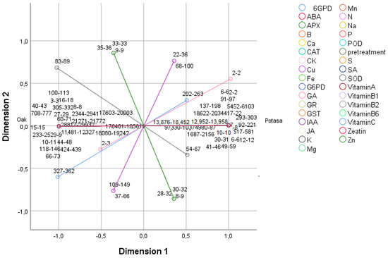 Principal component analysis (PCA). Relationships between different dipping solutions and the two-dimensional projection of salicylic acid (SA); gibberellic acid (GA); abscisic acid (ABA); indol-3-acetic acid (IAA); cytokinin (CK); jasmonic acid (JA); zeatin; glutathione reductase (GR); glucose-6-phosphate dehydrogenase (@G6PD); glutathione S-transferase (GST); ascorbate peroxidase (APX) catalase (CAT); peroxidase (POD); superoxide dismutase (SOD) enzymes; vitamins A, B1, B2, B6, and C; nitrogen (N); phosphorus (P); zinc (Zn); manganese (Mn); calcium (Ca); sulfur (S); potassium (K); iron (Fe); sodium (Na); boron (B); magnesium (Mg); and copper (Cu) in the first two main components for the Gök Üzüm grapes, which were dried after dipping in oak ash and potassium carbonate (Potas) solutions.