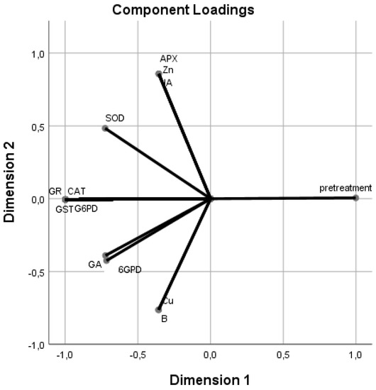 Principal component analysis (PCA). Two-dimensional (PC1 and PC2) projection of salicylic acid (SA); gibberellic acid (GA); abscisic acid (ABA); indol-3-acetic acid (IAA); cytokinin (CK); jasmonic acid (JA); zeatin; glutathione reductase (GR); glucose-6-phosphate dehydrogenase (G6PD); glutathione S-transferase (GST); 6 glucose phosphate dehydrogenase (6GPD); ascorbate peroxidase (APX) catalase (CAT); peroxidase (POD); superoxide dismutase (SOD) enzymes; vitamins A, B1, B2, B6, and C; nitrogen (N); phosphorus (P); zinc (Zn); manganese (Mn); calcium (Ca); sulfur (S); potassium (K); iron (Fe); sodium (Na); boron (B); magnesium (Mg); and copper (Cu) analyzed in the first two principal components. The values in the figure show the lower and upper data of the analyzed variables.
