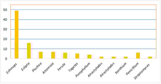 Thiophenes are among the heterocyclics that have been located in the focus of research interest for the last decades. They are a class of sulfur-containing molecules usually composed of one to five thiophene units connected at the α-position and often have various alkyl groups at the α’-carbon of the terminal ring [8]. Thiophene derivatives have beneficial applications in the dye, pharmaceutical, and agrochemical industries [9,10]. Interestingly, many of the approved drugs available in the markets have thiophene moiety, including antiasthma, NSAIDs (non-steroidal anti-inflammatory drugs), diuretics, anticancer, and antihistaminic drugs [11,12]. Natural occurring thiophenes represent rare constituents reported from these metabolites that have been isolated from various Asteraceae genera: Echinops, Eclipta, Pluchea, Artemisia, Tagetes, Porophyllum, Atractylodes, Atractylodes, and Xanthium. Additionally, some are reported from Ferula (family Apiaceae), as well as from actinomycetes (Streptomyces) and fungi (Penicillium) (Figure 1) [8].