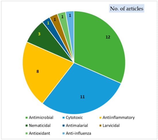 The reported thiophenes were investigated for various bioactivities. In this regard, these metabolites are associated with some types of biological actions, including antimicrobial, antiviral, anti-inflammatory, larvicidal, antioxidant, insecticidal, cytotoxic, and nematicidal effects. The results of the most active metabolites are summarized.