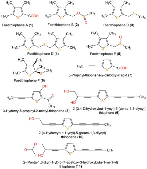- Ibrahim, S.R.M.; Abdallah, H.M.; El-Halawany, A.M.; Mohamed, G.A. Naturally occurring thiophenes: Isolation, purification, structural elucidation, and bioactivities. Phytochem. Rev. 2016, 15, 197–220. [Google Scholar] [CrossRef]