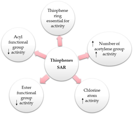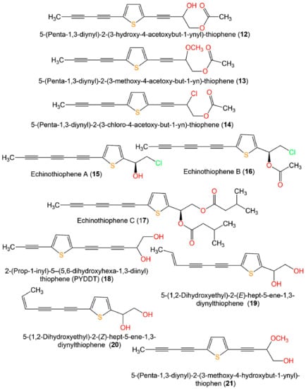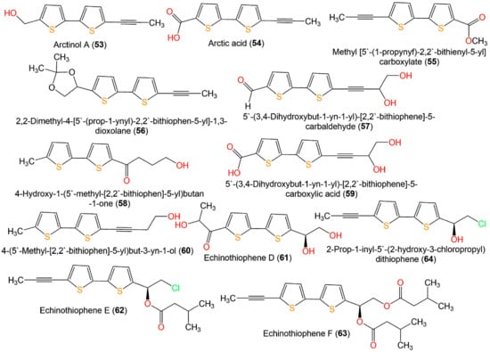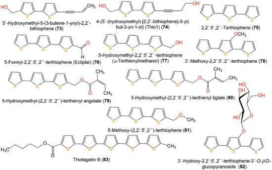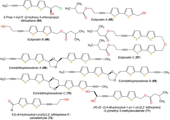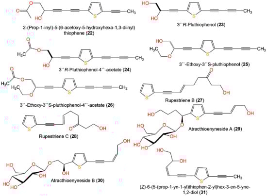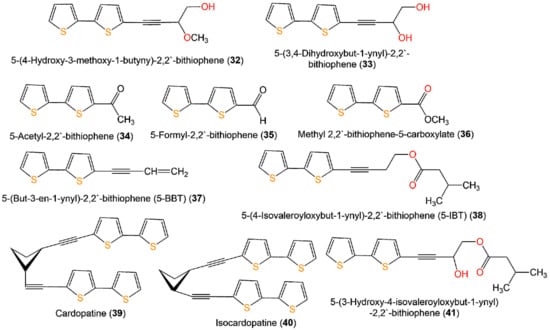 They are produced as a chemical defense mechanism and are toxic to various pathogens, such as insects, nematodes, bacteria, and fungi [13,14]. Biosynthetically, they are derived from fatty acids or polyacetylenes through acetylene intermediates; therefore, they are named acetylenic thiophenes. Indeed, many of the reported derivatives possess an alkyl chain with an acetylenic unit that may contain chiral centers due to introducing a hydroxy group [8]. These metabolites have remarkable biological and pharmacological effectiveness, including antiviral, antimicrobial, antileishmanial, anti-inflammatory, larvicidal, antioxidant, insecticidal, HIV-1 (human immunodeficiency virus-1) protease inhibitory, cytotoxic, nematicidal, and phototoxic effects [8,15,16,17,18,19,20] (Figure 2).