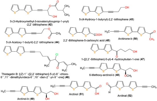 In our previous review, 96 natural thiophene derivatives were listed from various plant species belonging to the Asteraceae family till 2015, with a particular focus on their biosynthesis, bioactivities, and physical and spectral data [8]. Recently, several reviews dealing with synthetic thiophene-based derivatives, including their anti-inflammation and anticancer potentials, spectroscopic properties, and synthesis, were published [21,22,23,24]. On the other side, there is no available review on naturally occurring thiophene derivatives from plant sources.