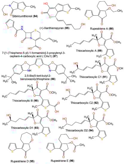 Therefore, the current review aims to provide an update over the past seven years for the naturally reported thiophene derivatives, including their sources, biosynthesis, spectral data, and bioactivities. In total, 96 compounds have been listed that have been categorized according to the number of rings into mono-, bi-, ter, and quinque-thiophenes and miscellaneous derivatives. Additionally, their source, molecular weights and formulae, location, and fraction/extract from which they were isolated are listed in Table 1. The physical constants and spectral data of the newly reported thiophenes (Table S1) from 2015 to 2021 are included. Further, their possible biosynthetic pathways are illustrated in Scheme 1 and Scheme 2 and bioactivities are highlighted in Table 2. We hope that this review can help natural product researchers for structural characterization of these metabolites and direct the medicinal chemist to the synthesis of potentially more active new thiophene derivatives. A systematic search for the published data was performed in various databases, including Web of Science, PubMed, Scopus, and Google scholar. Moreover, published papers in different publishers such as ACS (American Chemical Society), Elsevier, Bentham, Sage, Wiley, Taylor & Francis, Thieme Medical, and Springer were surveyed. No language restrictions were applied.