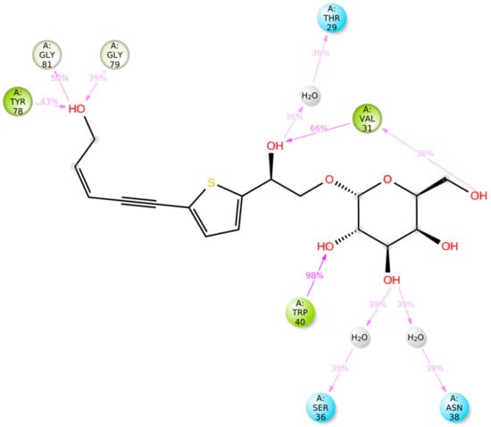 These compounds were assessed for anti-inflammatory activity versus RAW 264.7 cells. Only 9, 33, and 43 (IC50s 2.5, 20.0, and 6.7 µg/mL, respectively) exhibited significant in vitro anti-inflammatory potential toward LPS-boosted NO production in RAW 264.7 cells compared to indomethacin (IC50 65.4 µg/mL) in the colorimetric assay [28]. Zhang et al. purified three new derivatives: rupestrienes A–C (86, 27, and 28), Artemisia rupestris EtOH extract by SiO2, RP-18, and Sephadex CC. Rupestrienes B and C (27 and 28) displayed significant inhibitory potential (IC50 8.5 and 5.3 μM, respectively) toward LPS-caused NO production in BV-2 microglial cells, compared to quercetin (IC50 4.3 μM), 86 was weakly active (IC50 20.3 μM) [36]. Jin et al. assessed the inhibitory potential of 19, 20, 48, 49, 51, and 55 toward NO production boosted by LPS in RAW 264.7 cells. Only 19, 20, 48, and 49 exhibited moderate inhibitory potential (IC50 12.8–48.7 µM), compared to indomethacin and aminoguanidine (IC50s 13.2 and 24.2 µM, respectively) (Table 2). On the other side, 51 and 55 did not have any activity (IC50 ˃100 µM) [34]. The structure–activity relationship revealed that the monothiophenes with two acetylene units were more potent than bithiophenes with one acetylene unit. The existence of the Δ10,11 cis double bond and 1,2-diol at C-5 enhanced the inhibitory activity [34].