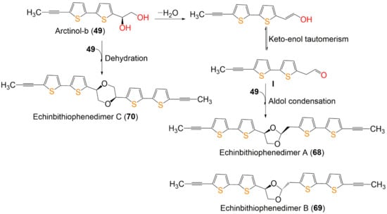 Wu et al. reported the biogenetic pathways of dimeric bithiophenes 68–70 (Scheme 1). These compounds had an unparalleled dimeric bithiophene skeleton containing two bithiophene units linked by uncommon cyclic diether units. It was proposed that they may be originated from arctinol-b (49). For 68 and 69, the formation of the 1,3-dioxolane ring may be obtained from an aldol condensation. Firstly, a key intermediate (I) is produced from 49 by dehydration and keto–enol tautomerism. After that, an aldol condensation among 49 and I would give 68 and 69. Additionally, an intermolecular dehydration reaction between two 49 molecules forms the 1,4-dioxane unit to give 70 [17].