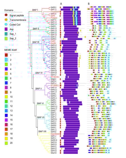 In order to characterize StAPs at the primary structure level, the presence of domains and conserved motifs were analyzed on the 62 amino acid sequences (Figure 2A, B).
