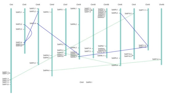 Chromosome distribution of 62 StAP genes. Potato physical map (in bp) built by Agrobiotech tools based on PGSC DM3.4 sequence [50]. Blue lines connect genes in segmental duplications blocks previously reported [80], and green fine lines represent possible cases of segmental duplication detected.
