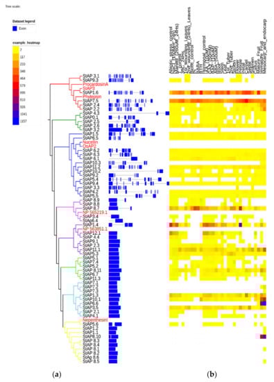 Twenty-six out of sixty-two genes presented a constitutive expression in different tissues or organs (Figure 4). Some StAP genes revealed preferential expression and tissue-specific patterns. High constitutive expression levels in most plant organs and tissues were associated with clusters StAPI (with StAP1.6, StAP7.5), StAPIV (with StAP8.7), StAPV (with StAP1.4, StAP7.5, StAP11.1), and StAPVII (StAP1.3 and StAP3.5), while the highest transcript level was related to cluster StAPVI (StAP1.4, StAP11.1) on petiole, to cluster StAPVIII (with StAP8.10) on fruits, and to cluster StAPVII (with StAP10.1 and StAP6.6) on mesocarp and endocarp tissues.