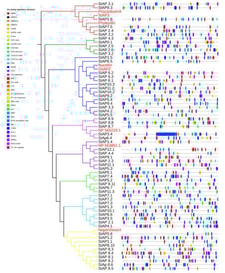 In silico identification of cis-acting elements in promoters of StAP. Colored boxes represent each element position in the coding strand.