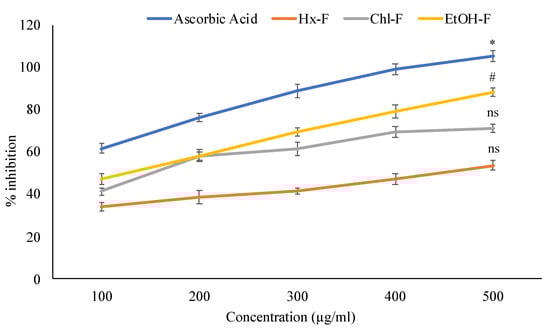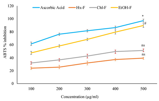 ABTS antioxidant activity of S. mangifera fruit fractions. Data are expressed as means ± SEM (n = 3), with a significance test for comparison with ascorbic acid using ANOVA followed by Dunnet’s ‘t’ test. * p < 0.01, # p < 0.05 and ns p > 0.05 = non-significant.