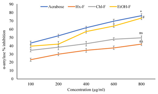 Percentage inhibition of S. mangifera fruit extract fractions (SMFEF) on α-amylase (p < 0.05). Data are expressed as means ± SEM (n = 3), with a significance test for comparison with acarbose using ANOVA followed by Dunnet’s ‘t’ test. * p < 0.01, # p < 0.05 and ns p > 0.05 = non-significant.