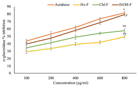 Percentage inhibition of S. mangifera fruit extract fractions (SMFEF) on α-glucosidase. Data are expressed as means ± SEM (n = 3), with a significance test for comparison with acarbose using ANOVA followed by Dunnet’s ‘t’ test. * p < 0.01, # p < 0.05 and ns p > 0.05 = non-significant.