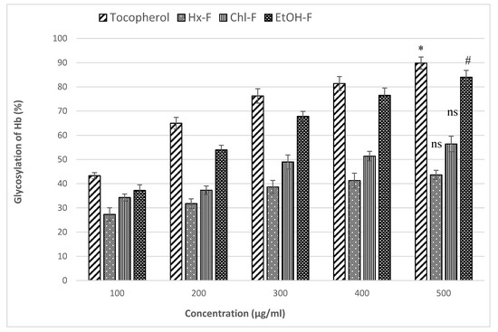 Figure 7 showed the percentage inhibition for the glycosylated Hb of S. mangifera fruit extract fractions at different concentrations like 100, 200, 300, 400, and 500 µg/mL. In this study, tocopherol was used as a standard same as the above concentrations. The maximum glycosylated Hb percentage inhibitory activity was significant (p < 0.05) shown in ethanolic fraction (83.97 ± 2.88%) at 500 µg/mL. In comparison, the hexane (43.64 ± 1.85%) and chloroform (56.39 ± 3.21%) fraction was showed nonsignificant (p > 0.05) glycosylated Hb percentage inhibitory activity when compared with tocopherol (89.92 ± 2.53%) at the same concentration.