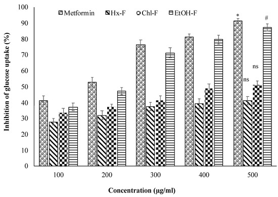 Inhibition of glucose uptake by yeast cell of S. mangifera fruit fractions (SMFEF). Data are expressed as means ± SEM (n = 3), with a significance test for comparison with Metformin using ANOVA followed by Dunnet’s ‘t’ test. * p < 0.01, # p < 0.05 and ns p > 0.05 = non-significant.