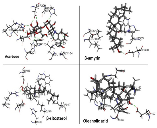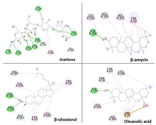 Three essential components were docked onto the active site of pancreatic α-amylase (PBD ID:3BAJ, Resolution:2.10), utilizing the Glide XP docking methodology and the Schrodinger Maestro GUI, to gain insight into their mechanism of action. Oleanolic acid, beta-sitosterol, and beta amyrin showed a strong affinity for pancreatic α-amylase. Our docking methodology was supported by the result of co-crystallized ligand Acarbose, which exhibited a similar binding posture to the crystal structure [36]. In addition, high similarities were shown by β-amyrin, β-sitosterol, oleanolic acid, and acarbose when coupled with α-amylase in their respective bound states. The hydrophobic interactions with β-amyrin, β-sitosterol, and oleanolic acid were mediated by a set of residues, including Leu165A, Trp59A, and Trp62A. These residues are reported to be important for pancreatic alpha-amylase binding [33]. The Leu162A Glide XP score and interacting binding residues are summarized in Table 1. Figure 9 and Figure 10 shows 2D and 3D depictions of β-amyrin, β-sitosterol, oleanolic acid, and acarbose binding at the interface of pancreatic α-amylase chain A.