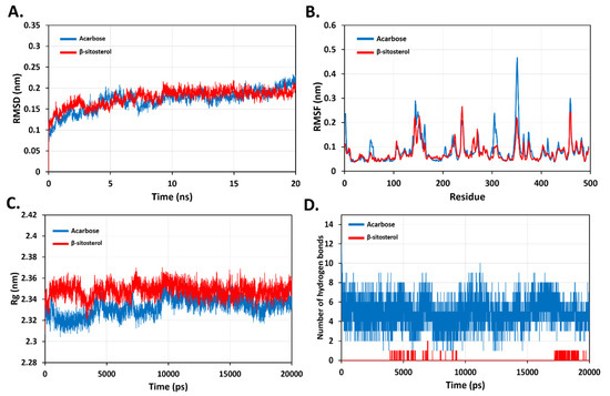 GROMACS 2018.1 package systems were used to run the MD simulations for the top docked poses of the standard molecule, acarbose, and a-sitosterol complexes with pancreatic alpha-amylase (PDB ID: 3BAJ) using the OPLS-AA all-atom force field and the TIP3P water model, as described earlier [34]. In summary, topological parameters for simulated ligands were generated using the SwissParam web service (https://www.swissparam.ch/ (accessed on 10 February 2022) [35]. A cubic box with at least 1 nm separation from the protein-ligand complex was used to solvate and neutralize the complexes. The counter ions used were 0.15 M of (Na + Cl) as counter ions. A steepest descent algorithm approach was then used to reduce the energy consumption of the complexes. The lenience was 1000 kJ/mol/nm of maximum step size of 0.01 nm. The Linear Constraint Solver method was used to create bond length constraints (LINCS). Using the particle mesh Ewald (PME) approach, electrostatic calculations were performed. Equilibration was carried out for 100 ps utilizing “canonical ensembles NVT” and NPT (isobaric–isomerical ensemble). After then, a 20-ns production run was completed. Using GROMACS 2018.1 packages, key MD parameters such as root-mean square deviation (RMSD), root mean square fluctuations (RMSF), number of hydrogen-bond (HB), and radius of gyration (Rg) were investigated.