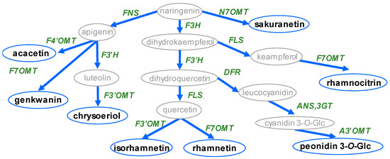 Schematic diagram of known methoxylated flavonoid aglycone biosynthesis. Circles indicate metabolite name, arrows indicate biosynthesis pathway, and words in italics indicate biosynthesis genes. Abbreviations: FNS: flavone synthesis; F3H: flavanone 3-hydroxylase; FLS: flavonol synthase; F3′H: flavonoid 3′-hydroxylase; DFR: dihydroflavonol 4-reductase; ANS: anthocyanin synthase; 3GT: flavonoid 3-O-glucosyltransferase; F7OMT: flavonoid 7-O-methyltransferase; F3′OMT: flavonoid 3′-O-methyltransferase; F4′OMT: flavonoid 4′-O-methyltransferase; A3′OMT: anthocyanin 3′-O-methyltransferase; N7OMT: naringenin 7-O-methyltransferase.