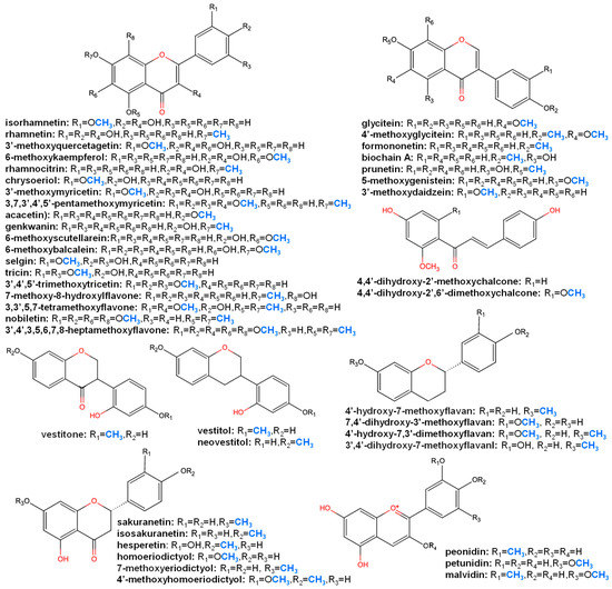Through a database survey of the KNApSAcK core system ([31]; http://www.knapsackfamily.com/knapsack_core/top.php, accessed date: 14 May 2021) (57,906 metabolites, 24,412 species and 137,333 metabolite–species pairs), 1598 flavonoids were found to be methoxylated flavonoid derivatives (with methoxylated aglycone of flavonols, flavones, isoflavones, flavanones, isoflavanones, flavans, isoflavans, flavanols and anthocyanidin) (Figure 2) found in plant species.