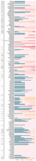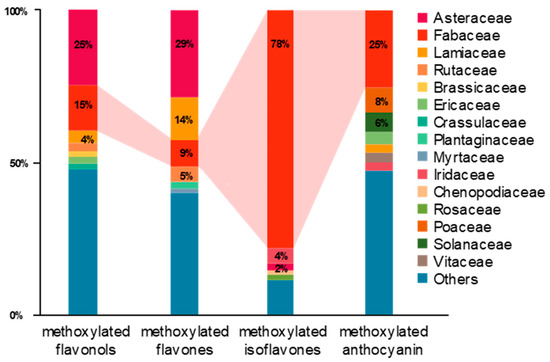 In our survey and data mining, Fabaceae, Asteraceae, Lamiaceae and Rutaceae were the top four families in terms of the diversity of methoxylated flavonoids. As for the distribution of each group of methoxylated flavonoids, Asteraceae (25%), Fabaceae (15%), Lamiaceae (4%), Rutaceae (3%), Brassicaceae (2%) and Ericaceae (2%) occupied almost 50% of the variety of methoxylated flavonols (Figure 3). In the same manner, Asteraceae (29%), Lamiaceae (14%), Fabaceae (9%), Rutaceae (5%) and Plantaginaceae (2%) held over 58% of the variety of methoxylated flavones. For methoxylated anthocyanidin and isoflavones, the Fabaceae family possessed the most diverse compounds (Figure 3). Notably, the Fabaceae family was found to be rich in methoxylated isoflavones, with 78% among investigated families.