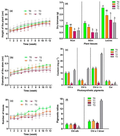Behavior of morphometric parameters, growth, and dry biomass of C. sericea. (a) Height of the plant. (b) Diameter of the stem. (c) Number of leaves. (d) Dry biomass per tissue for each treatment, total biomass is the sum of tissues per treatment. (e) Photosynthetic pigments. Chlorophyll a. Chlorophyll b. Chlorophyll a + b. Carotenoids. (f) Pigments ratios. Chlorophyll a/b. Chlorophyll a + b/carotenoids. Different letters indicate significant statistical differences (p < 0.05) using Tukey’s test between each treatment per variable.