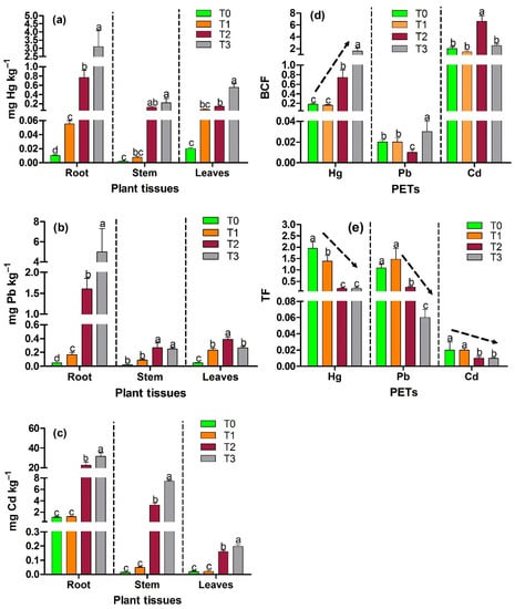 Concentration of PTEs in plant tissue and phytoremediation indices (a) Hg. (b) Pb. (c) Cd. (d) BCF. (e) TF. Different letters indicate significant statistical differences (p < 0.05) using Tukey’s test between each treatment per tissue.