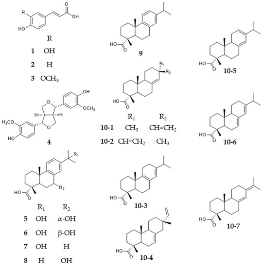 Hydroxycinnamic acids (1–3), lignans (4), and diterpene resin acids (5–8, 9 (300 Da), 10-1–10-7 (302 Da)) contained in Norway spruce balm. 1—caffeic acid, 2—p-coumaric acid, 3—ferulic acid, 4—pinoresinol, 5—7α,15-dihydroxydehydroabietic acid, 6—7β,15-dihydroxydehydroabietic acid, 7—15-hydroxydehydroabietic acid, 8—7-hydroxydehydroabietic acid, 9—dehydroabietic acid, 10-1—pimaric acid, 10-2—sandaracopimaric acid, 10-3—palustric acid, 10-4—isopimaric acid, 10-5—levopimaric acid, 10-6—abietic acid, 10-7—neoabietic acid.