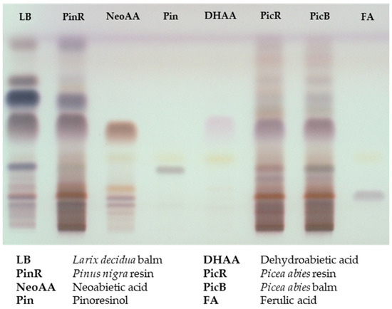 TLC is a planar chromatography technique and provides a time- and cost-effective phytochemical fingerprint of multiple samples at the same time [25]. It should allow the comparison of the qualitative composition of the three exudates. We analyzed the extracts together with selected representatives of different substance classes present in resins and balms of Pinaceae as references i.e., ferulic acid (3, hydroxycinnamic acid), pinoresinol (4, lignan), dehydroabietic acid (9), and neoabietic acid (10-7, diterpene resin acids). Figure 2 shows the resulting TLC plate after derivatization with anisaldehyde/sulphuric acid solution.