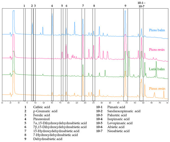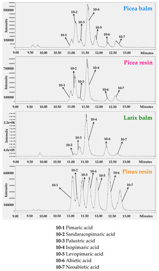 The four analyzed samples differed in the relative content of the various diterpene resin acids. Only the balm of Picea abies and the resin of Pinus nigra contained all of the seven resin acids, although in different quantities. Levopimaric acid (10-5) was not detected in Norway spruce resin and larch balm. Furthermore, pimaric acid (10-1) has not been detected in larch balm.