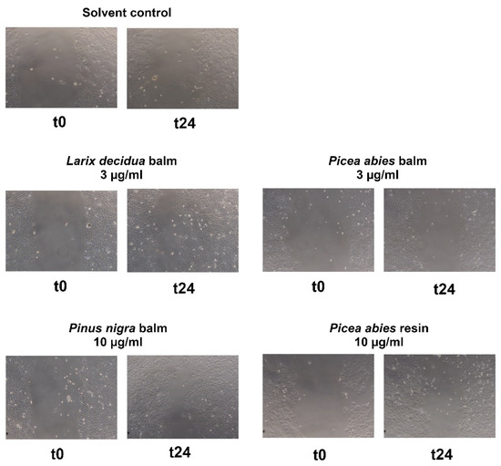 Effects of conifer resins and balms at different concentrations on scratch wound healing of HaCaT cells at timepoint t0 and after 24 h (t24).