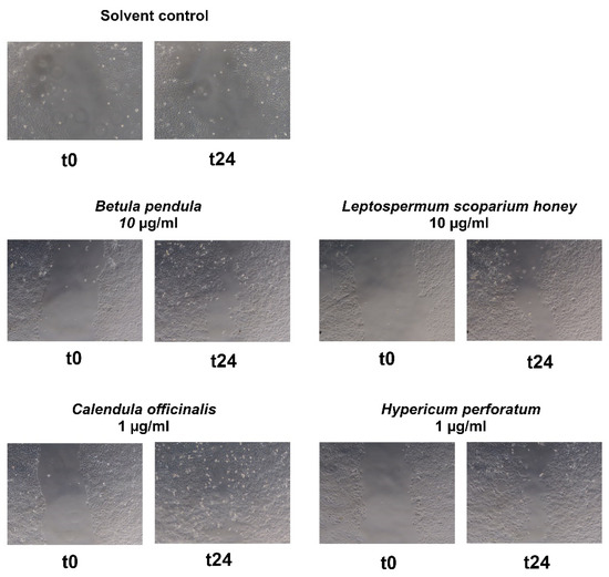 In order to better rank the activity of the tested exudates, we also ran the assay with other traditionally used wound-healing agents. Betula pendula (10 µg/mL: +41.6%), Calendula officinalis (1 µg/mL: +62.1%), and Leptospermum scoparium honey (Manuka honey) (10 µg/mL: +42.0%) demonstrated statistically significant differences to the vehicle control (see Figure 6). The extract of Hypericum perforatum showed moderate activity on keratinocytes (see Table 2). Concentration-dependency was shown for birch and Manuka honey.