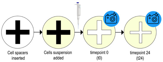The establishment of uniform cell gaps emerged as a challenge during the first experiments. The scratch assays followed the protocol published by Liang et al. [27], and scratches were initially introduced using a 200 µL pipette tip, which is frequently described in literature [28,29]. This procedure requires extreme caution, as one wants to disrupt only the cell layer by evenly sized scratches, but not to damage the coating of the cell culture vial (which would hinder the attached cells from migrating or proliferating). Various alternatives to the classical “pipette tip scratch” were sought that could guarantee reproducible sizes of the cell free area and intact surface coating at the same time. Inserts in the form of silicone cell spacers from Ibidi performed well, but were for single use only. Attempts for re-use failed, since the high temperature during sterilization caused increased adhesiveness of the silicone and again, destruction of coating during removal. Finally, the use of cross-shaped commercially available plastic inserts from LUX® tools was successful. They were re-usable and weighted down with small metal weights to allow formation cell-free gaps in a growing cell monolayer, with acceptable variation in size with concurrent intact coating.