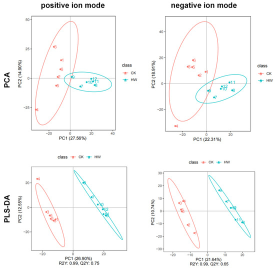 PCA and partial least squares discriminate analysis (PLS-DA) score chart of metabolite profiling data in positive ion mode and negative ion mode.