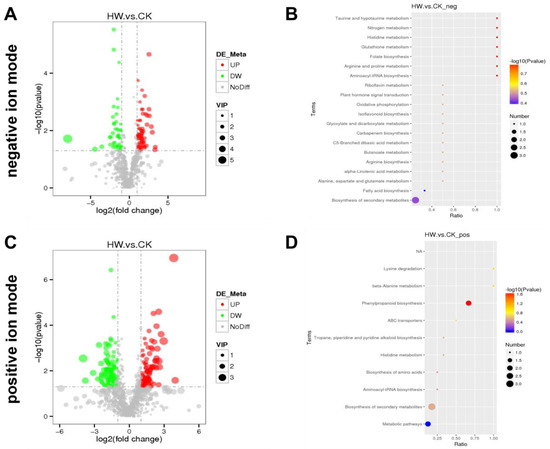 Metabolomics analysis of the hydrogen-water-treated group (HW) and the control group (CK). Volcano figure under negative ion mode (A) and positive ion mode (C); the green points represent the downregulated metabolites and the red points represent upregulating in the hydrogen water treated group. For the metabolite enrichment analysis under negative ion mode (B) and positive ion mode (D), the abscissa represents the ratio of the number of differential metabolites in the corresponding path to the total number of identified metabolites and the ordinate represents the impact of the path. The statistical significance is expressed in color gradient, and the size of the circle is directly proportional to the number of metabolites.