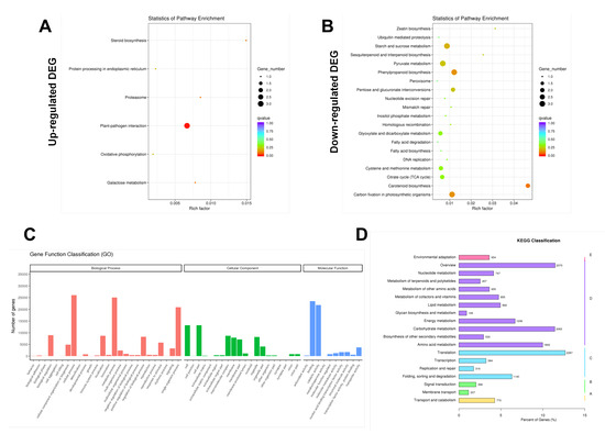 KEGG pathway enrichment analysis: KEGG [35] is a database resource (http://www.genome.jp/kegg/, accessed on 28 December 2021) used to understand the advanced functions and utilities of biological systems, such as cells, organisms, and ecosystems, from molecular level information, especially large-scale molecular data sets generated by genome sequencing and other high-throughput experimental technologies. KOBAS [36] software was used to test the statistical enrichment of differentially expressed genes in the KEGG pathway.