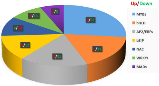 Transcription factors participate in plant hormone signal transduction, stress resistance, and secondary metabolite biosynthesis by regulating the gene expression in plants. In our data, we found 625 transcription factors with different expression levels using iTAK software (http://itak.feilab.net/cgi-bin/itak/index.cgi/, accessed on 28 December 2021), of which, 168 transcription factors with significantly differentially expressed levels were related to phenylpropanoid biosynthesis and defense signaling (Table S3). Among these transcription factors, the most abundant were MYBs (41) and bHLHs (27), followed by AP2/ERFs (26), bZIPs (20), NACs (16), WRKYs (14), AUX/IAAs (12), MADs (10), and HSFs (2) (Figure 5). These transcription factors contribute to plant hormone signal transduction, stress resistance, and secondary metabolite biosynthesis in Ficus hirta Vahl roots.